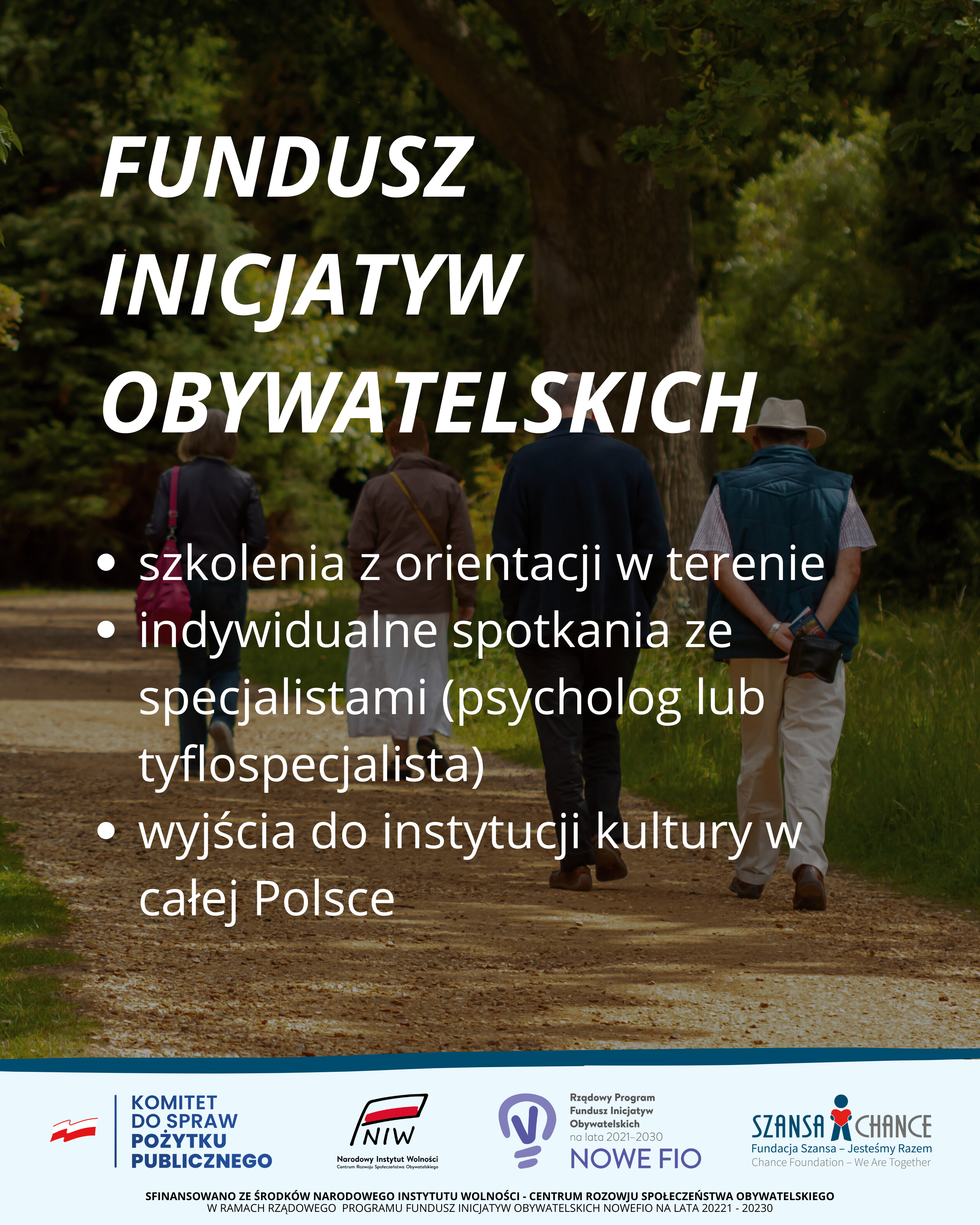 W Fundacja Szansa – Jesteśmy Razem rozpoczynamy realizację projektu w ramach programu NOWE FIO, którego celem jest zwiększenie samodzielności i aktywności osób niewidomych i słabowidzących. W najbliższych dwóch latach zorganizujemy szkolenia, spotkania ze specjalistami oraz integracyjne wyjścia do instytucji kultury w każdym z 16 województw w Polsce.