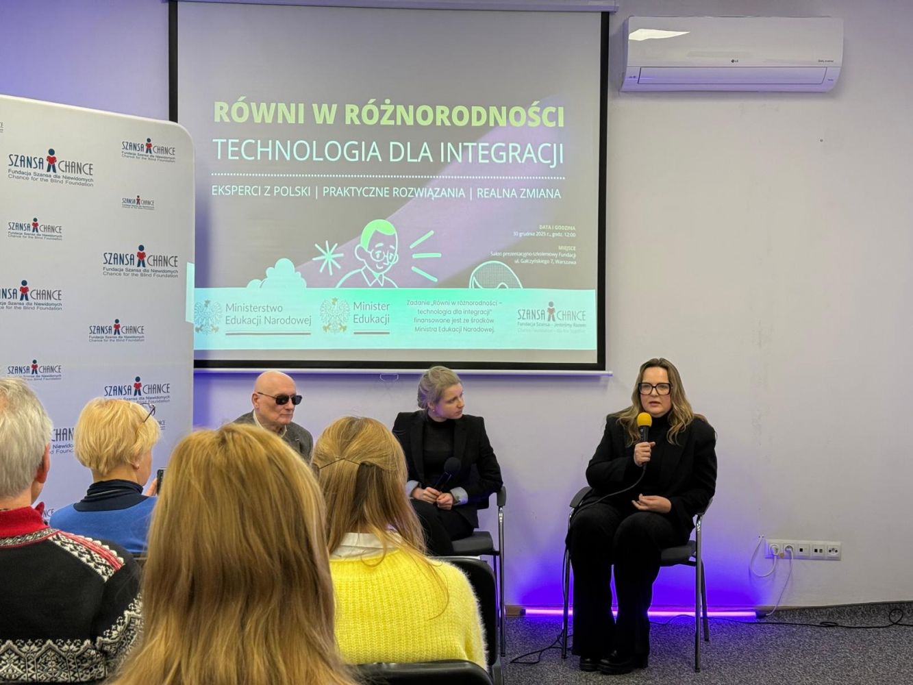 30 grudnia w Warszawie spotkaliśmy się, aby wspólnie podsumować ogólnopolski projekt edukacyjny „Równi w różnorodności – technologia dla integracji”, realizowany przez Fundację Szansa – Jesteśmy Razem i finansowany ze środków Ministerstwa Edukacji Narodowej. W konferencji wzięli udział eksperci, przedstawiciele instytucji edukacyjnych, nauczyciele oraz wszyscy zainteresowani tematyką dostępności – także online, dzięki dostępnej transmisji.