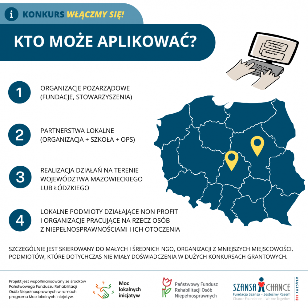 Konkurs grantowy „Włączmy się!” jest skierowany do organizacji działających na rzecz osób z niepełnosprawnościami z terenu województw mazowieckiego oraz łódzkiego. Łączna pula środków w konkursie wynosi 1 200 000 zł, z równym podziałem na oba województwa. Każda organizacja może ubiegać się o grant w wysokości od 15 000 zł do 70 000 zł.